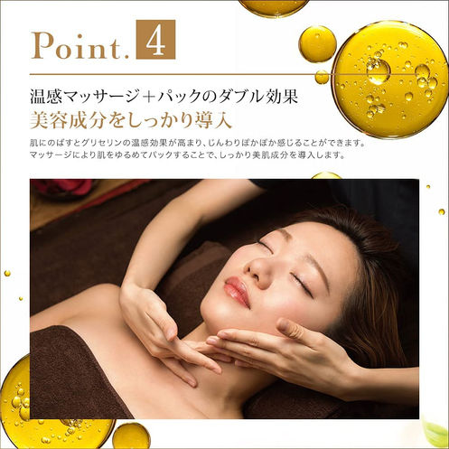 ゴールドの輝きとスッと弾ける美容ビタミンカプセルで高級感溢れるサロン級・トップクラスのスキンケアを体感。しっかり保湿すると同時にセラミド配合で外部からの刺激からお肌を守り、ハリとうるおいを与えます。温感マッサージ+パックのダブル効果で美容成分をしっかり導入。